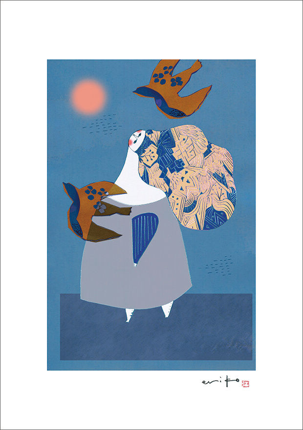 She believes "Art enriches our everyday life and shares us plenty of joy". This is the reason why she keeps on drawing. Tender colors and lines and her composition with full of phantasy seems to tell us a little heart warming story.